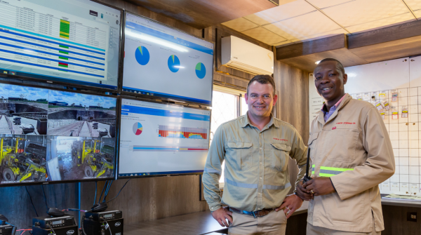 Frans Van Tonder, Supervisor (left), with Hope Kabambi, Operator (right), at Kakula’s state-of-the-art operations control room.