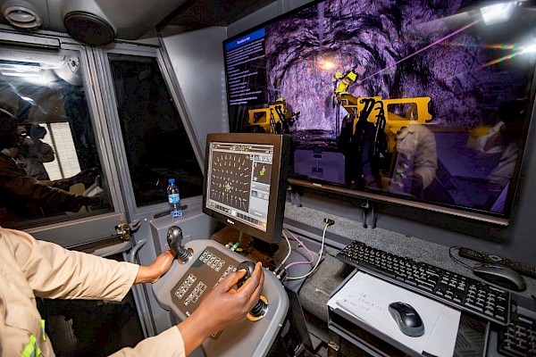 The underground development work at Kakula is being performed by mining crews operating large-capacity, semi-autonomous mining equipment, such as jumbo drilling rigs and 50-tonne trucks.