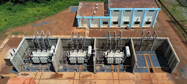 Aerial view of the new gas insulated substation (GIS) high-voltage substation at the Mwadingusha hydro-power plant. The upgrading program is restoring the plant to its installed output capacity of approximately 72 megawatts of clean, sustainable electricity.