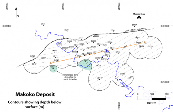 The initial discovery hole at Makoko, DD004, was drilled in September 2017. Follow-up and infill drilling has been ongoing since then. Drilling to date at Makoko has defined a flat-lying, near-surface stratiform copper deposit, similar to the Kamoa and Kakula deposits. The structure contour map indicates that the mineralized formation in the Makoko area is within 1,000 metres of surface (see Figure 1 on page 4). The majority of the drilling to date at Makoko has intersected the copper-rich zone between 400 metres and 800 metres below surface. Figure 4 on page 7 shows a three-kilometre section along strike where the flat-lying, copper-rich zone is between 400 metres and 500 metres below surface.