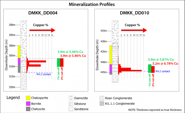 - DD010 intersected 3.21 metres (true width) of 6.78% copper, at a 2.0% copper cut-off, and 3.95 metres (true width) of 5.81% copper at a 1.0% copper cut-off, from a downhole depth of 441 metres.