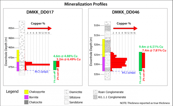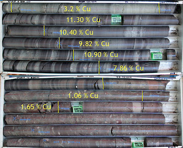 - DD046 intersected 7.44 metres (true width) of 7.81% copper at a 2.0% copper cut-off, and 9.39 metres (true width) of 6.51% copper, at a 1.0% copper cut-off, from a downhole depth of 523.51 metres.