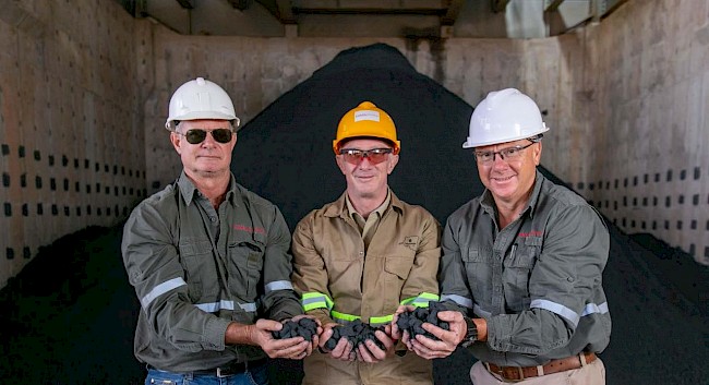 (L-R) Mark Farren, Kamoa Copper’s CEO; Steve Amos, Kamoa Copper’s Head of Projects; and Wimpie Steyn, Risk Control Manager, holding some of Kamoa Copper’s first copper concentrate.