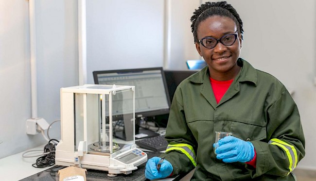 Ruth Karaj Irung, SGS Lab Assistant, in the weighing room at the new assay lab.