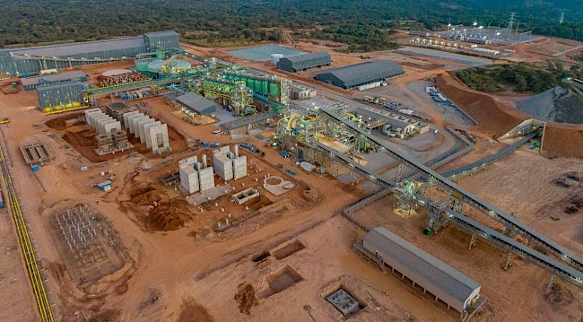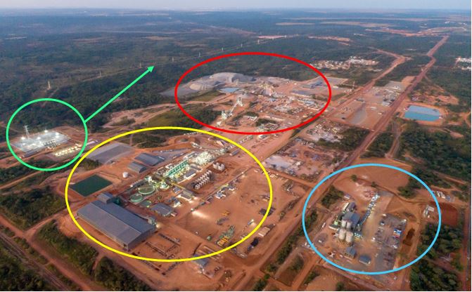 Aerial view of the Kakula Mine. The northern portal, run-of-mine stockpile and main pre-production stockpiles are within the red circle. The Phase 1 concentrator, the concentrator storage shed, and the foundations for the Phase 2 concentrator are within the large yellow circle; the backfill plant is in the blue circle; the main 220-kilovolt electrical substation is in the green circle; and the green arrow points to the new 220-kilovolt powerline.