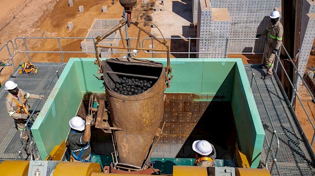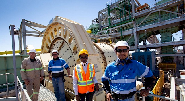 Members of the commissioning team at one of two balls mills at the Phase 1 concentrator. (L-R) Eddie Mong, Instrumentation Superintendent, Kamoa Copper; Aldo Groenewald, Commissioning Manager, DRA; Vongani Nkuna, Group Manager, Metallurgy, Kamoa Copper; Raul Bowers, Lead Process Engineer, DRA.