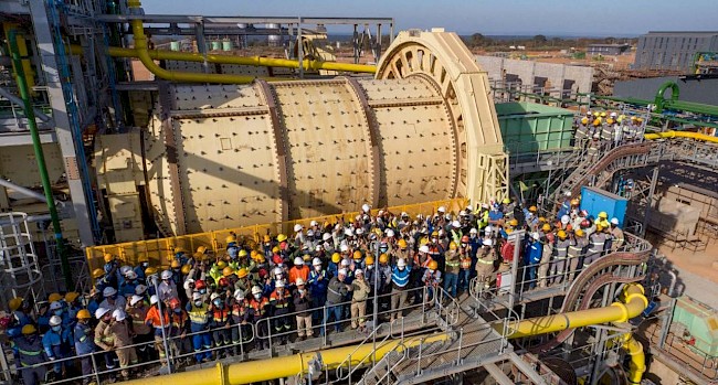 Crew members and contractors celebrating the commissioning of the ball mills.
