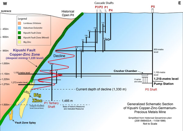 Before Kipushi was idled in 1993, Gécamines discovered the Big Zinc Deposit at a depth of approximately 1,250 metres below surface and adjacent to the producing Fault Zone (see Figure 1). No mining ever has been conducted on the Big Zinc’s mineral resources.