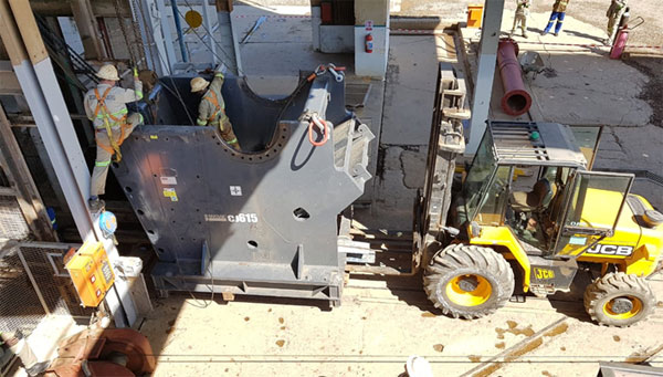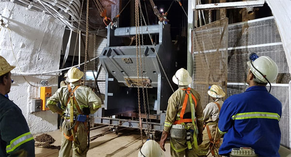 Main frame of the new underground rock crusher secured onto the base plate at the 1,150-metre level, ready for reassembly and commissioning.