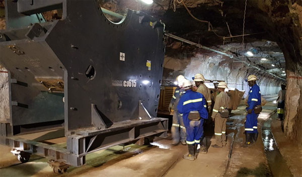 The main frame being transported to the 1,150-metre-level crusher chamber.