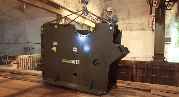 The crusher’s largest single unit, the 19-tonne main frame, being prepared to be lowered down Shaft 5.