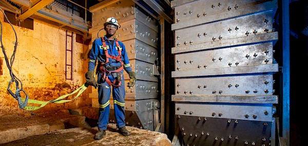 Shaft 5 is eight metres in diameter and 1,240 metres deep. It now has been upgraded and re-commissioned. The main personnel and material winder has been upgraded and modernized to meet international industry standards and safety criteria. The Shaft 5 rock-hoisting winder now is fully operational, with new head- and tail-ropes also installed. The two newly manufactured rock conveyances (skips) and the supporting frames (bridles) have been installed in the shaft to facilitate the hoisting of rock from the main ore and waste storage silos feeding rock on the 1,200-metre level.