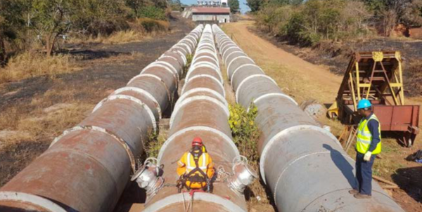 Photo: Engineers inspecting pipes (penstocks) feeding water to turbines driving generators inside the Mwadingusha hydroelectric power plant
