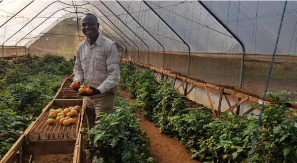Photo: Fabrice Mazeze with fresh tomatoes produced in the livelihoods vegetable garden.