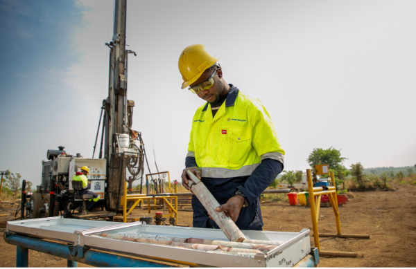 Photo: Héritier Tshiminyi Katembo, a driller with Ivanhoe’s contractor, Titan Drilling,examines a piece of drill core from the Makoko area on Ivanhoe’s 100%-owned Western Foreland exploration licences.