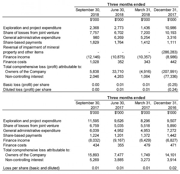 The company recorded a total comprehensive loss of $7.9 million for Q3 2018 compared to a total comprehensive loss of $21.2 million for the same period in 2017. Exploration and project expenditure for Q3 2018 amounted to $2.4 million and was $9.2 million less than for the same period in 2017 ($11.6 million). The decrease in exploration and project expenditure was the main reason for the decrease in the total comprehensive loss and is attributable to the capitalization of costs incurred at the Kipushi Project subsequent to the finalization of its PFS in December 2017.