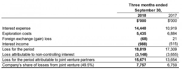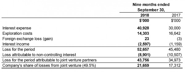 The company’s share of losses from the Kamoa Holding joint venture increased from $6.8 million in Q3 2017 to $7.8 million in Q3 2018. The following table summarizes the company’s share of the comprehensive loss from Kamoa Holding for the three months ended September 30, 2018, and for the same period in 2017: