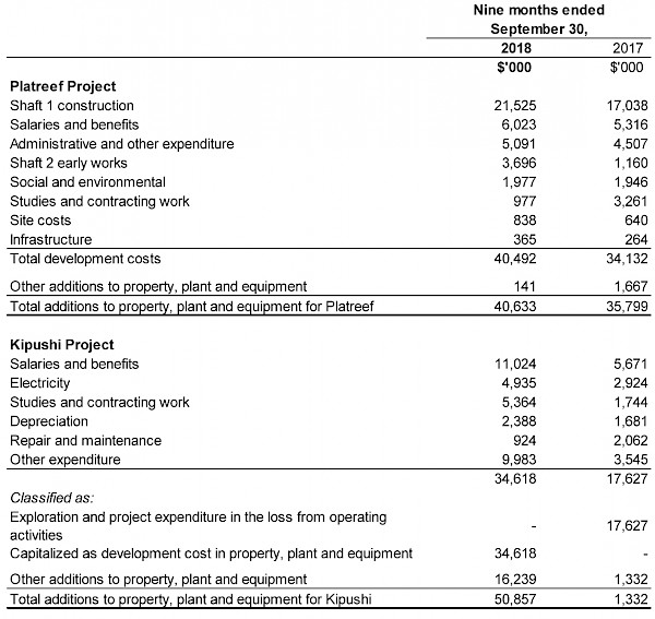 The main components of the additions to property, plant and equipment at the Platreef and Kipushi projects for the nine months ended September 30, 2018, and for the same period in 2017, are set out in the following table:
