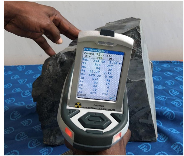 A sample of chalcocite-rich development ore from the Kakula Mine. Based on Niton (X-ray fluorescence or XRF) analysis, this sample grades 62.9% copper.