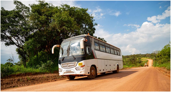 A Kamoa transport bus, used for carrying Kamoa-Kakula employees to the mine site from the city of Kolwezi, along a recently-completed section of the permanent new highway linking the Kakula Mine with the Kolwezi airport.