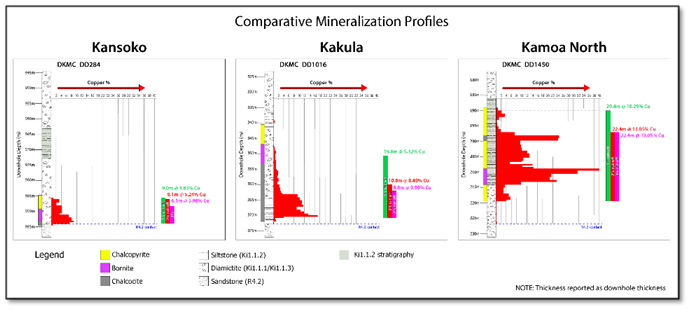 Grade profiles plotted on the same scale show the significance of the grades between the different discovery areas on the Kamoa-Kakula Project.