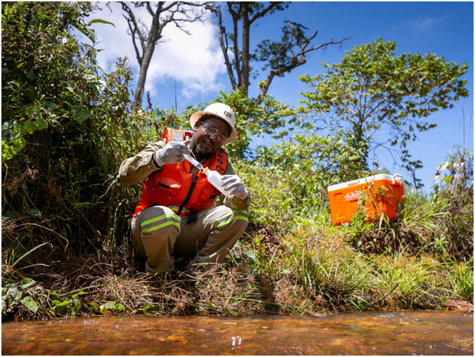 Ben Muding, Environment Officer, obtains a water sample from a stream near the Kamoa-Kakula Project. Ivanhoe Mines is committed to responsible water use in support of the United Nations’ Sustainable Development Goals with regard to access to water and sanitation, and responsible consumption and production.