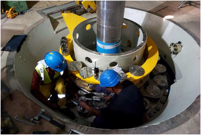 Assembling one of the six new turbines at the Mwadingusha hydropower plant. The upgrading program is restoring the plant to its installed output capacity of approximately 72 megawatts of clean, sustainable electricity.