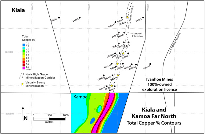 - Drilling also has confirmed the extension of the Kamoa North high-grade copper structure for at least 800 metres in the Kiala Discovery area, part of Ivanhoe’s 100%-owned Western Foreland licences that adjoin the Kamoa-Kakula mining licence to the north. The high-grade copper zone on Ivanhoe’s 100%-owned exploration licences is being delineated through a series of step-out fences of holes drilled in a northerly direction.