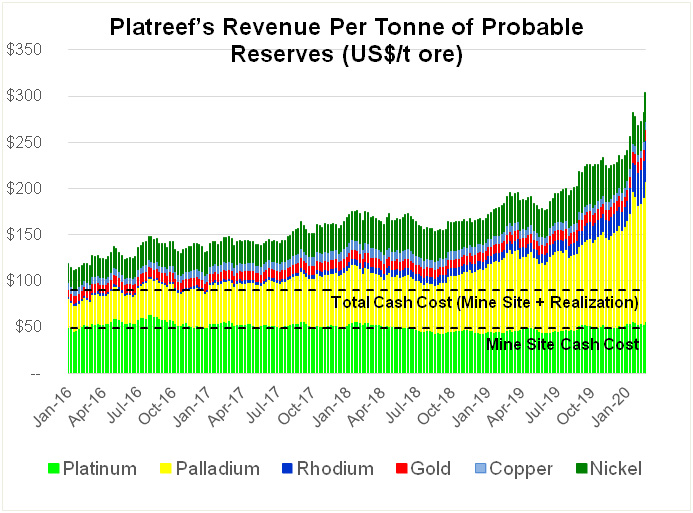 Led by the surge in prices of palladium and rhodium, Platreef’s ‘metals-price basket’ revenue per tonne of probable reserves recently reached a new, all-time high of more than $300.