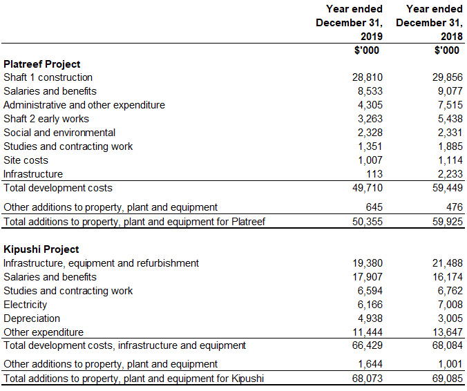 The main components of the additions to property, plant and equipment − including capitalized development costs − at the Platreef and Kipushi projects for the year ended December 31, 2019, and for the same period in 2018, are set out in the following table: