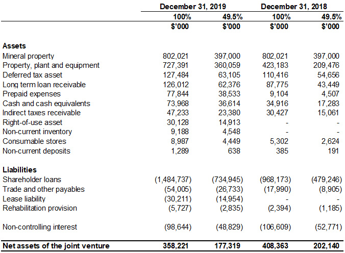 The company’s investment in the Kamoa Holding joint venture increased by $230.9 million from $681.7 million as at December 31, 2018, to $912.6 million as at December 31, 2019, with each of the current shareholders funding the operations equivalent to their proportionate shareholding interest. The company’s portion of the Kamoa Holding joint venture cash calls amounted to $202.3 million during the year ending December 31, 2019, while the company’s share of losses from the joint venture amounted to $24.8 million.