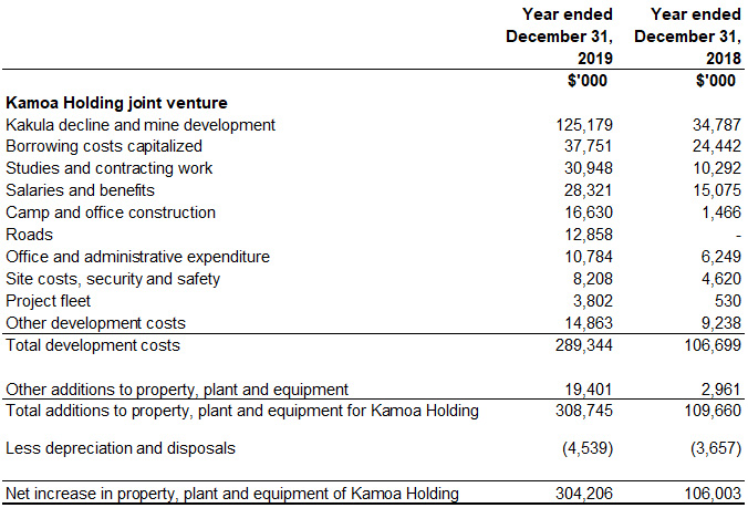 The Kamoa Holding joint venture’s net increase in property, plant and equipment from December 31, 2018, to December 31, 2019, amounted to $304.2 million and can be further broken down as follows: