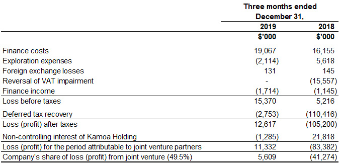 The company’s share of losses from the Kamoa Holding joint venture was $5.6 million for the three months ended December 31, 2019, compared to a profit of $41.3 million for the same period in 2018, the breakdown of which is summarized in the following table: