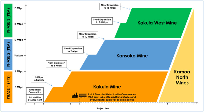 - Ivanhoe also announced an updated independent preliminary economic assessment (PEA) for an expanded Kakula-Kamoa production rate of 18 Mtpa, supplied initially by a 6 Mtpa mine at Kakula, followed by two 6 Mtpa mines at Kansoko and Kakula West, and a direct-to-blister smelter. The PEA envisions the staged mine expansions and smelter will be funded from internal cash flows and yields an after-tax NPV8% of $10.0 billion and an IRR of 41%. All figures in the PFS and PEA are on a 100%-project basis.