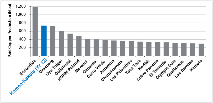 - Once the expanded PEA production rate of 18 Mtpa is achieved, Kamoa-Kakula is projected to become the world’s second largest copper mine, with peak annual production of more than 700,000 tonnes of copper.