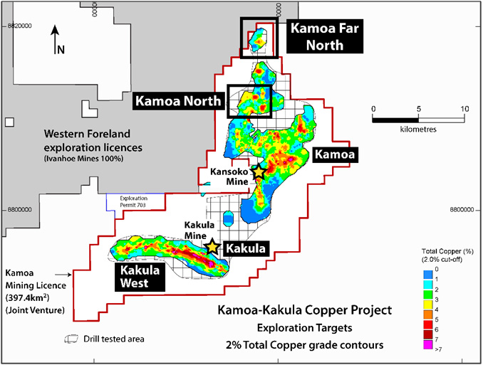 Figure 6: Kamoa-Kakula mining licence (outlined in red) showing the new, high-grade discoveries at Kamoa North and Kamoa Far North relative to the Kakula and Kansoko mine sites. A portion of Ivanhoe’s adjoining, 100%-owned Western Foreland exploration licences is shown in grey.