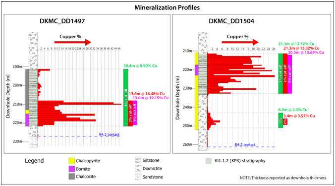 - DD1497 intersected 13.60 metres of 18.48% copper, at a 3% and 2% copper cut-off, in semi-massive sulphide KPS-hosted mineralization, beginning at a downhole depth of 208.00 metres; and 30.37 metres of 8.90% copper at a 1% cut-off.