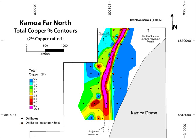- The controlling east-west striking fault responsible for the massive copper sulphide mineralization in the Kamoa North Bonanza Zone is visible on airborne magnetic images and can be traced over a distance length of at least 10 to 20 kilometres. It trends west onto the adjacent Western Foreland exploration licences that are 100%-owned by Ivanhoe Mines.