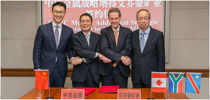 On April 25, 2019 CITIC Metal agreed to invest an additional C$612 million ($454 million) in Ivanhoe Mines at C$3.98 per share, bringing its investment in Ivanhoe to $1 billion. Left to right: Peter Zhou (Vice President, Corporate Development, Asia, Ivanhoe Mines), Yufeng “Miles” Sun (President, CITIC Metal Group / Chairman, CITIC Resources Holdings / Co-Chairman, Ivanhoe Mines), Robert Friedland (Executive Co-Chairman, Ivanhoe Mines) and Manfu Ma (Vice President, CITIC Metal Group).