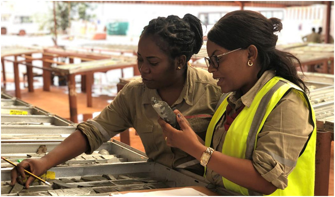 Geologists Lydia Makong (left) and Christelle Nkulu logging copper-rich drill core from the Kamoa North Bonanza Zone.