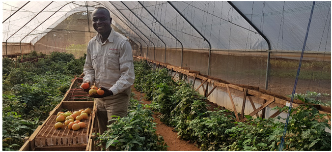 Fabrice Mazeze with fresh tomatoes produced in the Ecolivelihood vegetable garden. The initiative is part of Kamoa-Kakula’s program to support and expand food production in nearby communities.