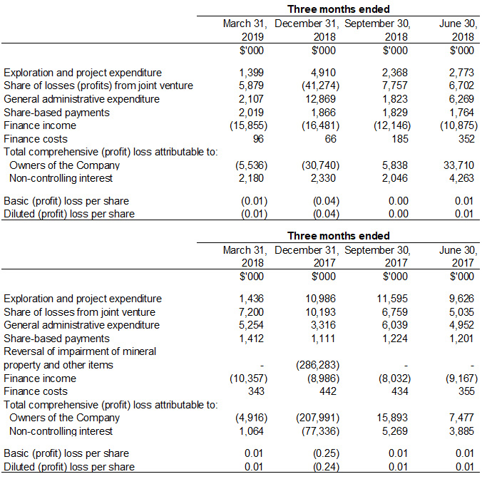 The company recorded a total comprehensive profit of $3.4 million for Q1 2019 compared to a profit of $3.9 million for the same period in 2018. Finance income for Q1 2019, amounted to $15.9 million, and was $5.5 million more than for the same period in 2018 ($10.4 million). The increase mainly was due to interest earned on loans to the Kamoa Holding joint venture to fund operations as the accumulated loan balance increased. This amounted to $12.0 million for Q1 2019, and $8.7 million for the same period in 2018. Interest received on cash and cash equivalents also increased due to a higher cash balance during Q1 2019.