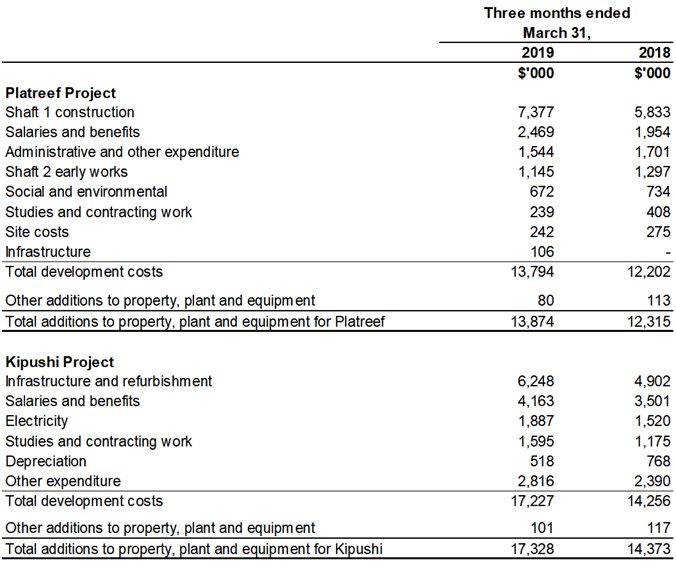 The main components of the additions to property, plant and equipment – including capitalized development costs – at the Platreef and Kipushi projects for the three months ended March 31, 2019, and for the same period in 2018, are set out in the following table: