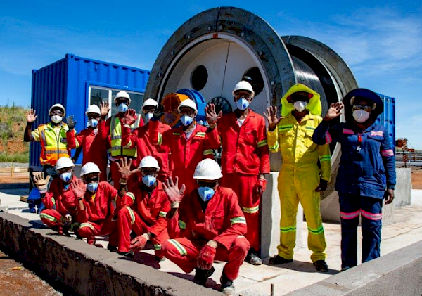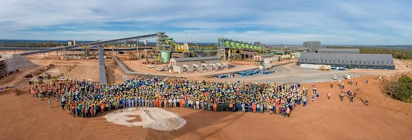 The Kakula concentrator plant and some of approximately 7,000 employees and contractors who helped construct the mine ahead of schedule and within budget.