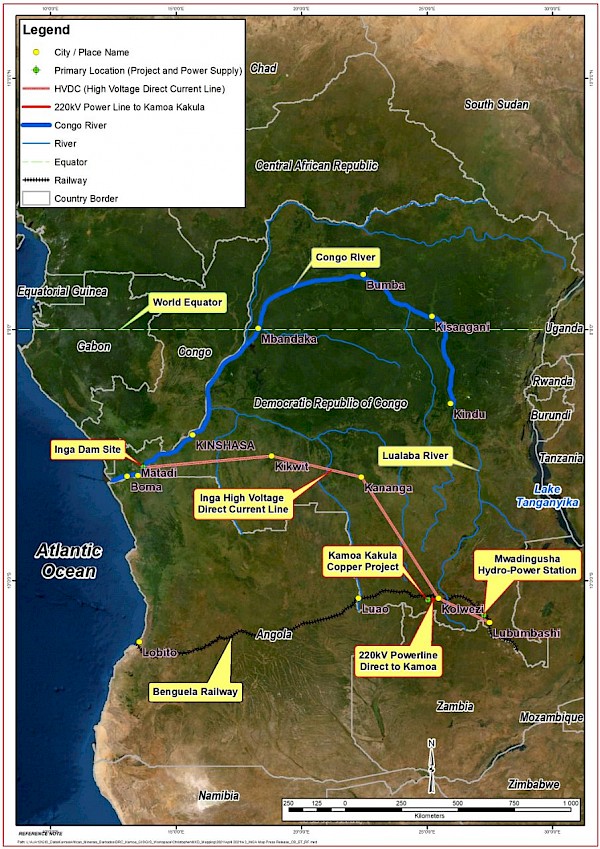 The map below shows the Inga andMwadingusha hydropower complexes, theInga high-voltage power line, the Kamoa-Kakula Project, the new 220-kV power line connecting Kamoa-Kakula to the national grid at Kolwezi, and the Benguela railway connecting the DRC to the Angolan port of Lobito.