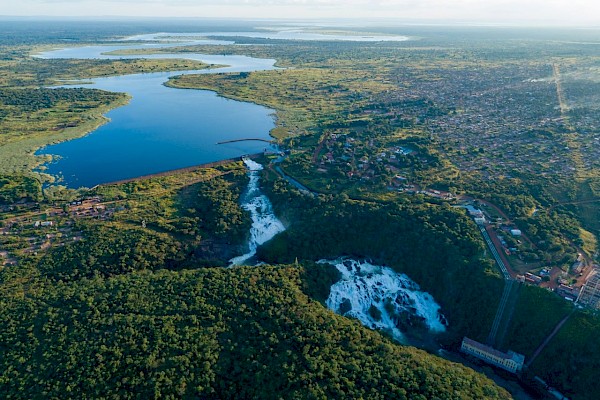 Aerial view of the 78-MW Mwadingusha hydropower plant, the reservoir and the community of Mwadingusha.