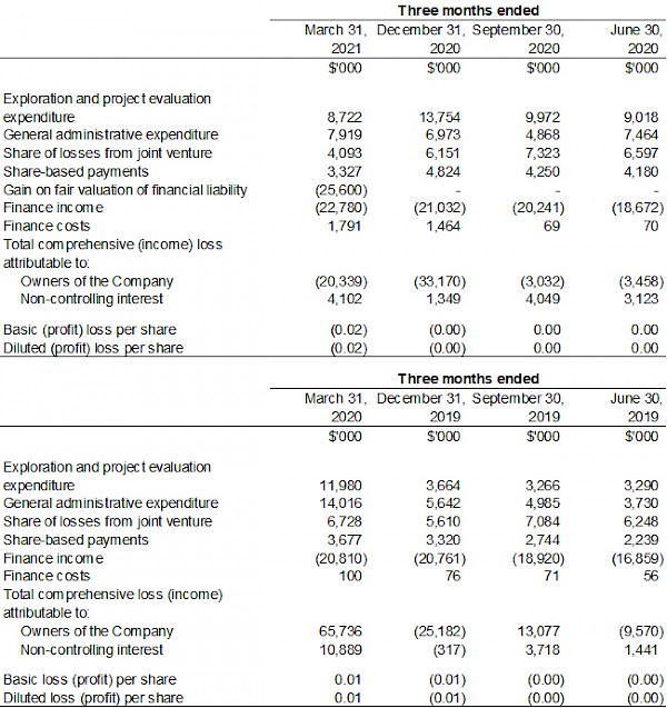 The following table summarizes selected financial information for the prior eight quarters. Ivanhoe had no operating revenue in any financial reporting period and did not declare or pay any dividend or distribution in any financial reporting period.