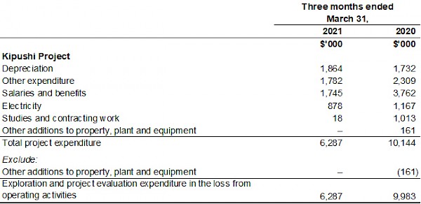 Exploration and project expenditure amounted to $8.7 million in Q1 2021 and $12.0 million for the same period in 2020. Exploration and project expenditure related to exploration at Ivanhoe’s Western Foreland exploration licences and amounts spent at the Kipushi Project which was on reduced activities and incurred limited cost of a capital nature in the periods. The main classes of expenditure at the Kipushi Project in Q1 2021 and Q1 2020 are set out in the following table: