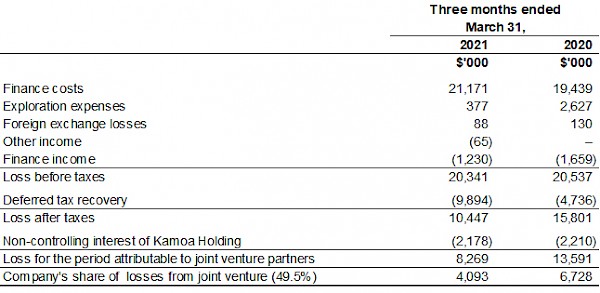 The company’s share of losses from the Kamoa Holding joint venture decreased from $6.7 million in Q1 2020 to $4.1 million in Q1 2021. The following table summarizes the company’s share of losses of the joint venture for the three months ended March 31, 2021, and for the same period in 2020: