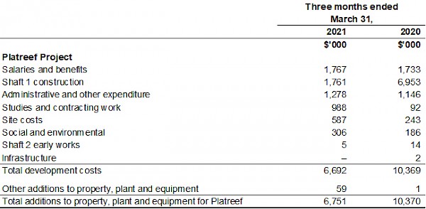 The main components of the additions to property, plant and equipment – including capitalized development costs – at the Platreef Project for the three months ended March 31, 2021, and for the same period in 2020, are set out in the following table: